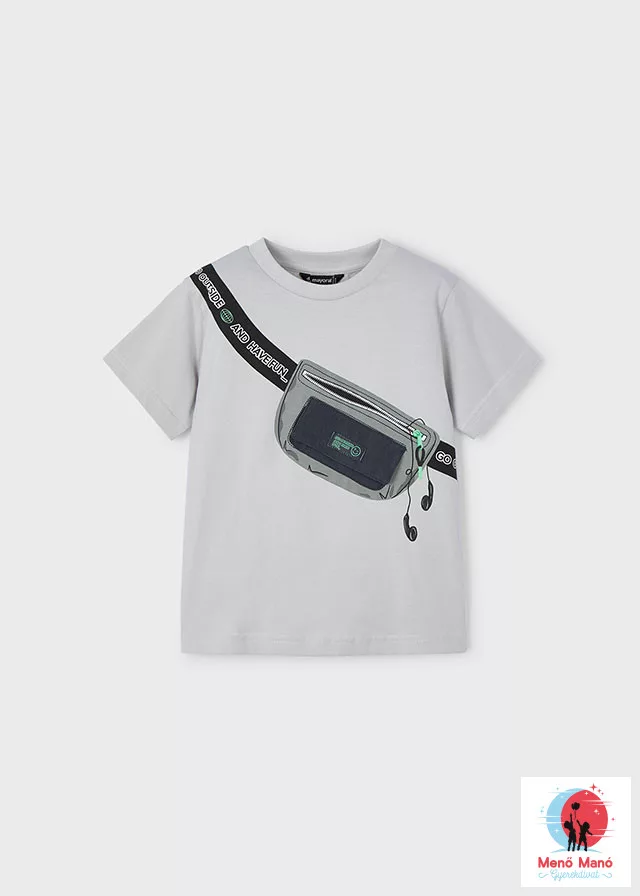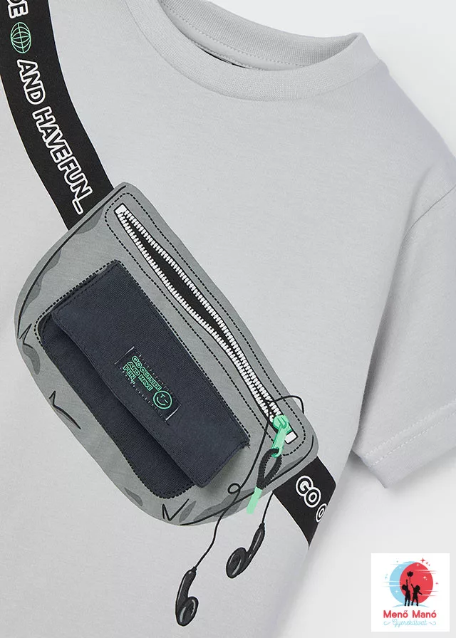Stílusos póló kis kalandoroknak eredeti övtáska mintával. A kényelmes szabás és a kiváló minőségű anyag egész napos viselési kényelmet biztosít. Tökéletes választás a mindennapi viselethez vagy a szabadidő eltöltéséhez.