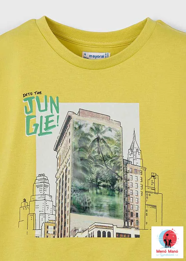Póló egy kis felfedezőnek, aki szeretné felfedezni a városi dzsungelt! Kifejező grafika vad természettel és építészettel a háttérben bevezeti Önt a kalandok világába. Az arany szín minden nap energiát és örömöt ad hozzá. Tökéletes nyári utazásokhoz vagy mindennapi sétákhoz – mert minden pillanat esély egy új történetre!