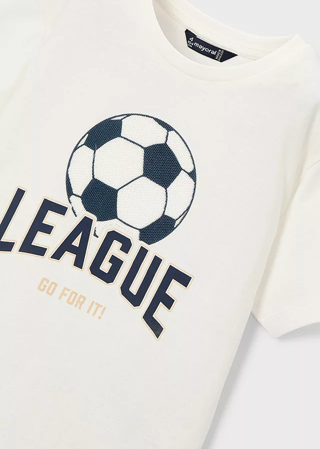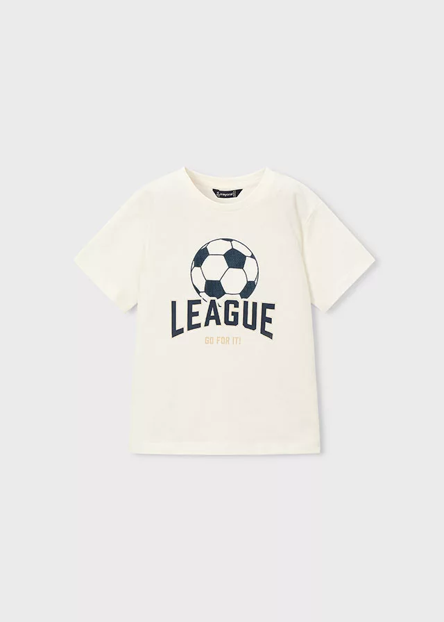 Mayoral fiú póló – focis mintával, „League” felirattal, bézs