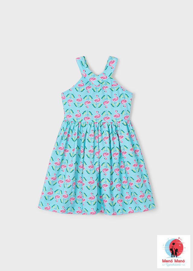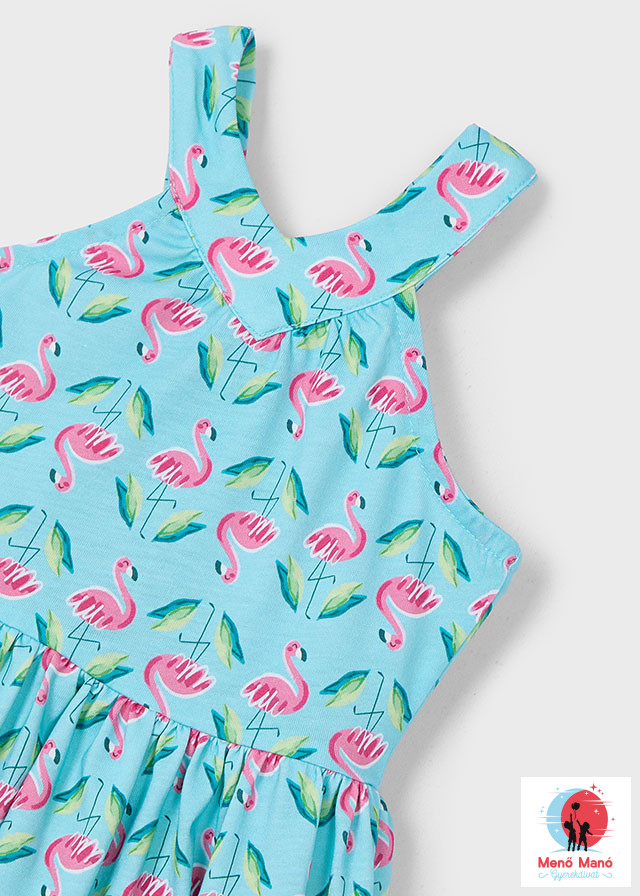 Ez a  flamingó motívumú nyári ruha tökéletes választás a nyári napokra! Az élénk türkiz színnek és a vicces mintának köszönhetően gyermeke aranyosan fog kinézni, ugyanakkor szabadon és kényelmesen érzi magát. Tökéletes tengerparti sétákhoz és családi kirándulásokhoz egyaránt.