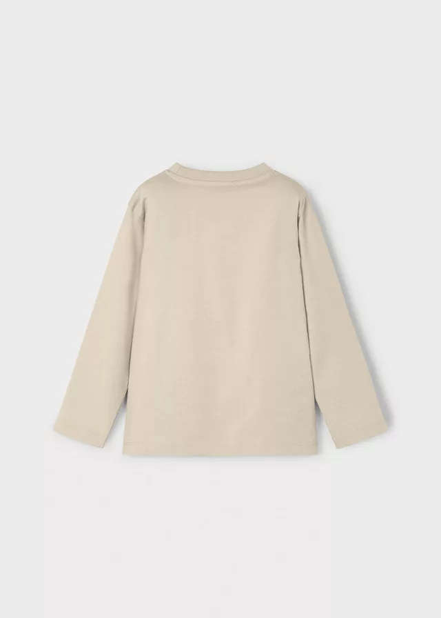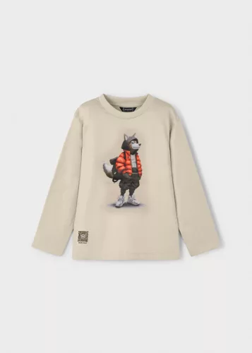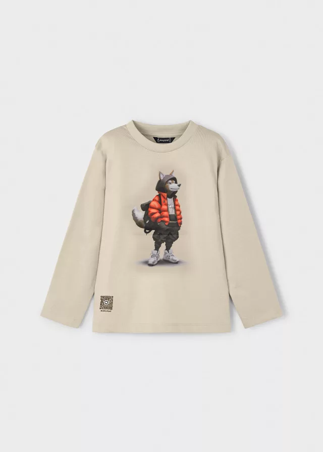 Stílusos és játékos hosszú ujjú fiú felső köles színben, amely interaktív élményt kínál: a QR-kód segítségével a gyermekek exkluzív Mayoral videojátékhoz férhetnek hozzá.