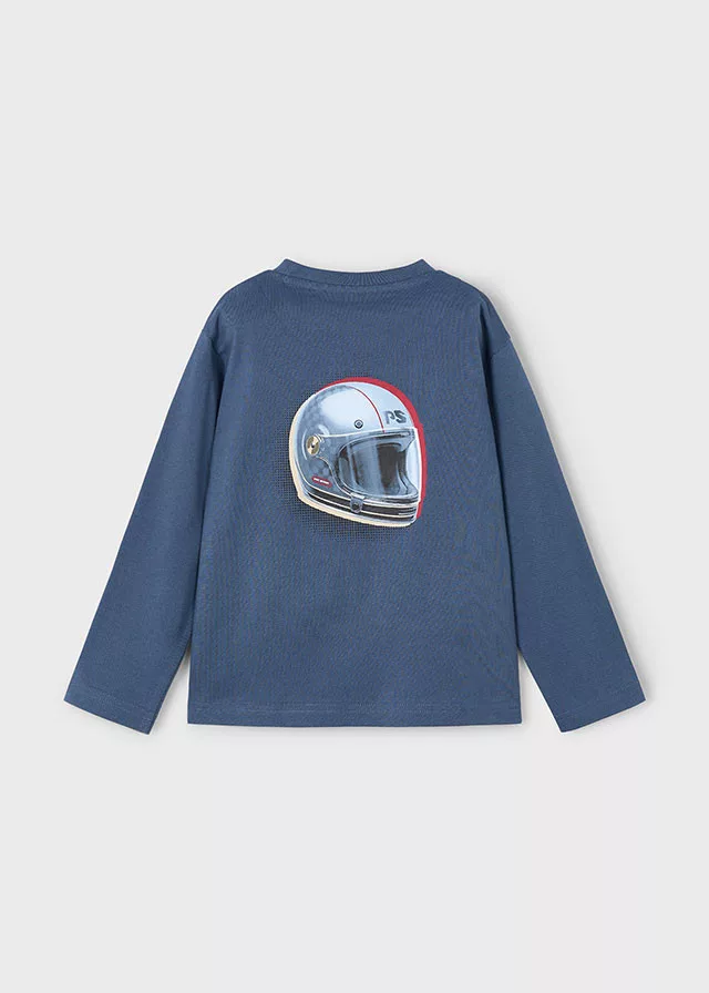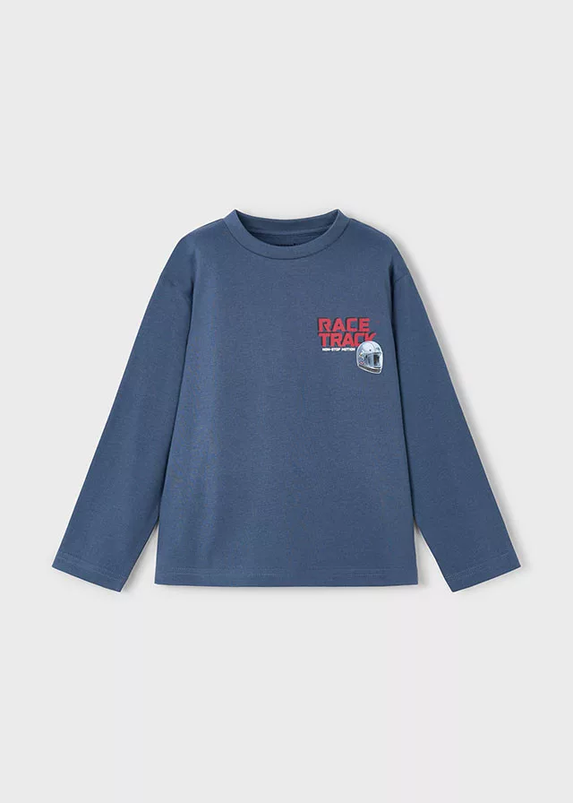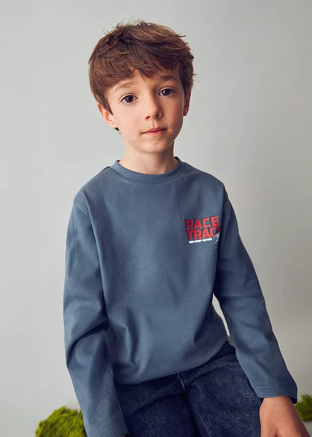Ez a Mayoral fiú hosszú ujjú felső a motoros kalandok hangulatát hozza el a gyerekek ruhatárába. A acero (acél-szürke) alapszín klasszikus és semleges tónus, amely jól kombinálható farmerrel, jogger nadrággal vagy melegítővel. Az elöl található „Race Track — Non-Stop Motion” felirat (versenypálya — megállás nélküli mozgás) lendületes, aktív életérzést közvetít, míg a kis bukósisak és a hátoldali nagy bukósisak vizuális dinamizmust ad a dizájnnak.