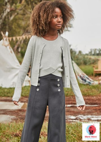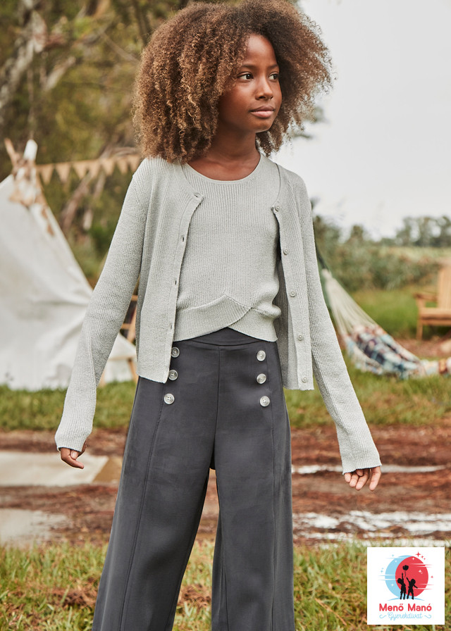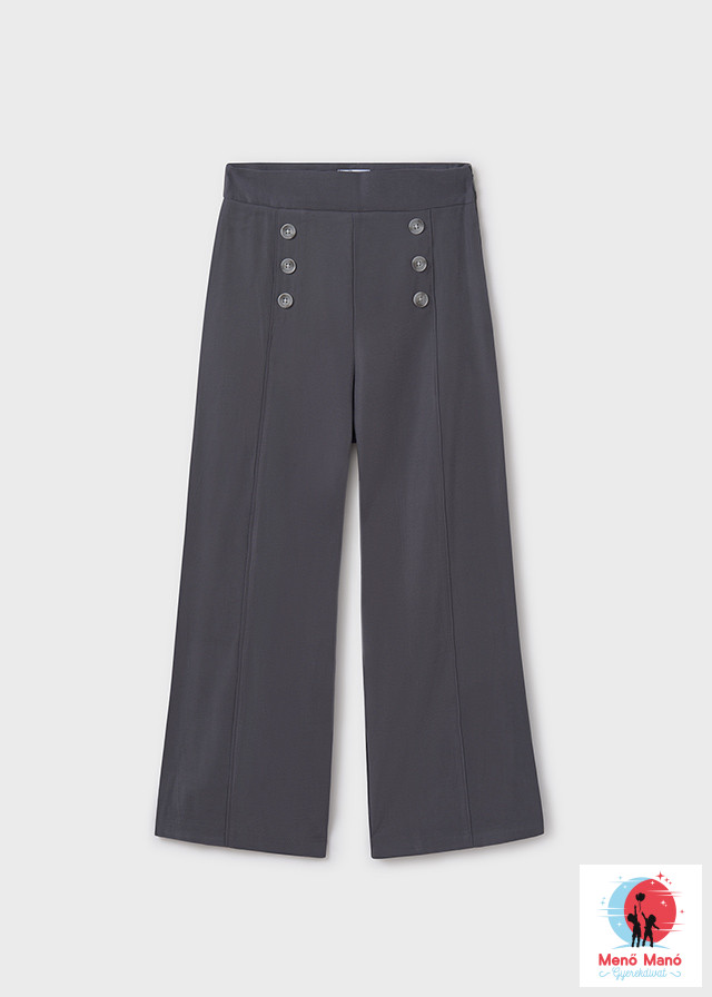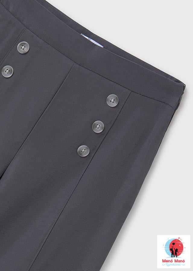 Elegáns lánynadrág a Mayoral márkától sötétszürke színben, ideális stílusos mindennapi viselethez és különleges alkalmakhoz. A nadrág modern, széles szabással rendelkezik, amely biztosítja a kényelmet és a mozgás szabadságát. Az elejét dekoratív gombsorok díszítik, amelyek tengeri hatást és kifinomult megjelenést kölcsönöznek.