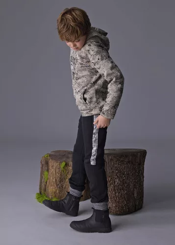Sportos és kényelmes Mayoral fiú melegítő nadrág fekete színben, modern megjelenéssel. A nadrág oldalán elhelyezett minta dinamikus, fiatalos stílust ad a klasszikus fazonnak. Puha, rugalmas anyaga egész napos komfortot biztosít aktív mozgás közben is. Ideális választás iskolába, szabadidős programokra és hétköznapi viseletre.