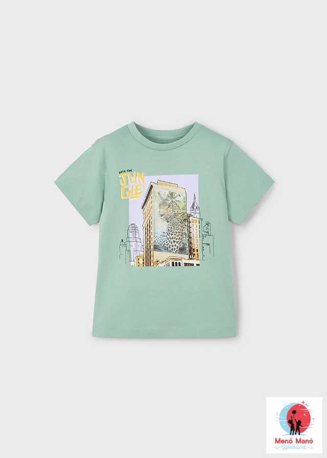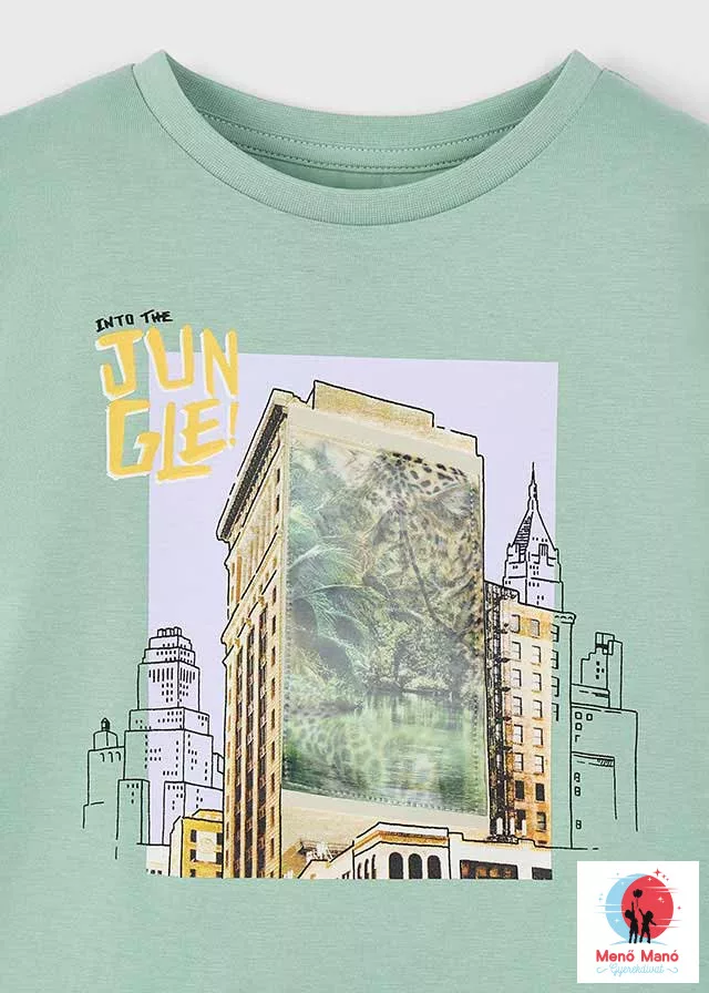 Póló egy kis felfedezőnek, aki szeretné felfedezni a városi dzsungelt! Kifejező grafika vad természettel és építészettel a háttérben bevezeti Önt a kalandok világába. Az zöld szín minden nap energiát és örömöt ad hozzá. Tökéletes nyári utazásokhoz vagy mindennapi sétákhoz – mert minden pillanat esély egy új történetre!