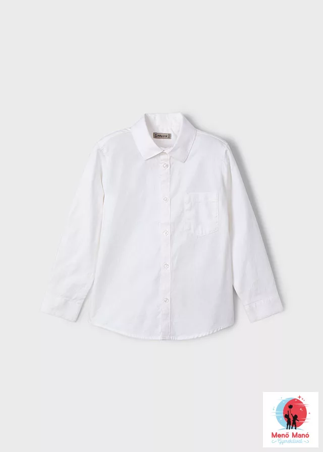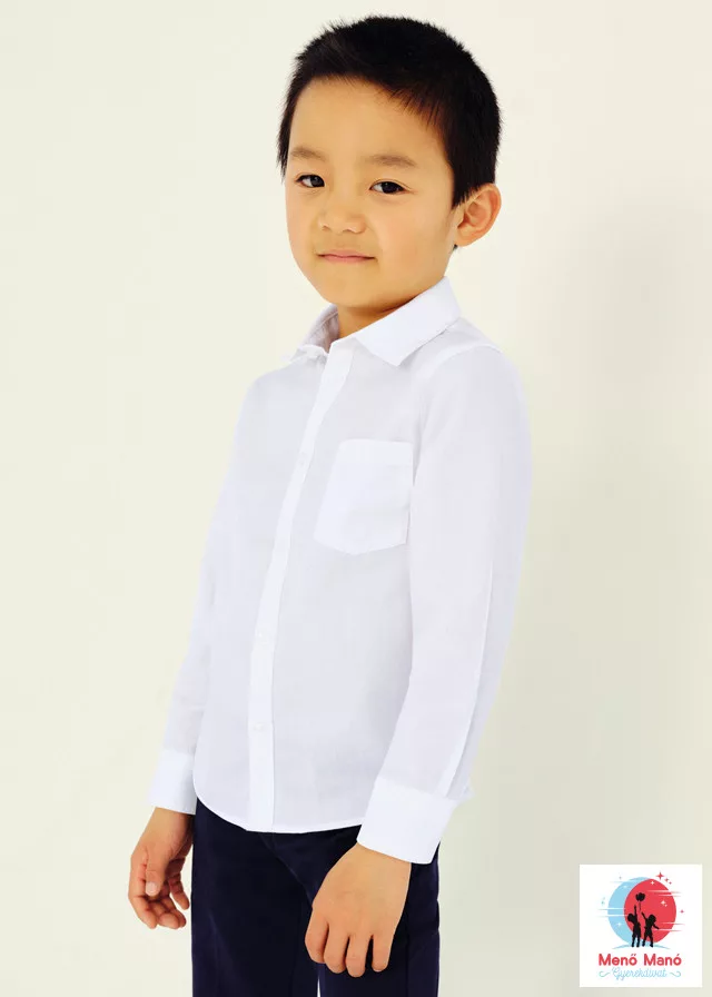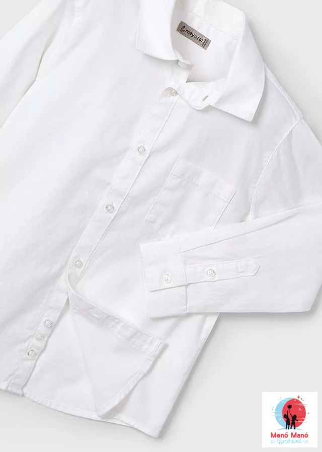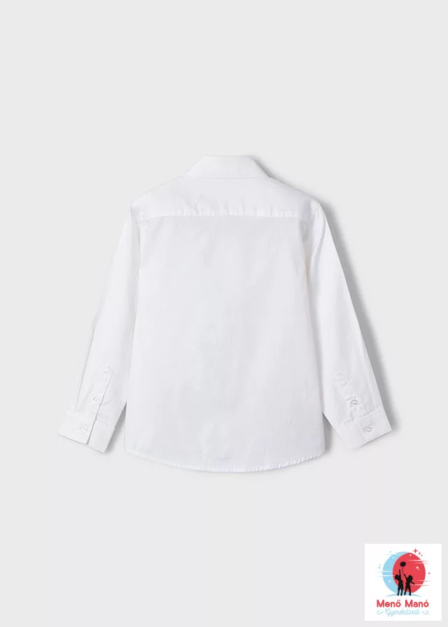 Mayoral fehér ing fiúknak. Puha pamutból készült. Hosszú ujjú, galléros nyakú elől gombos ing.