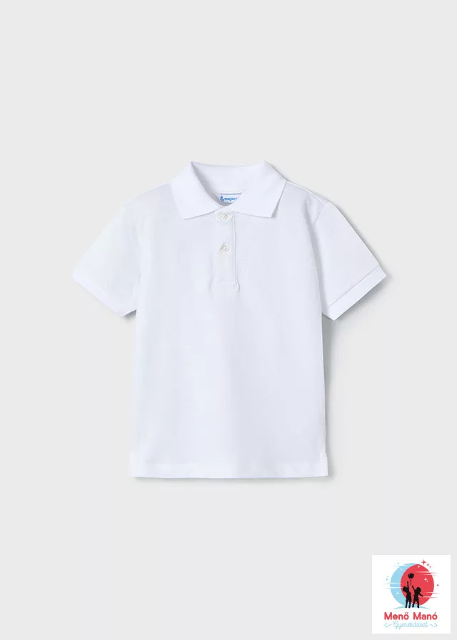 Klasszikus rövid ujjú Mayoral pólóing fiúknak elegáns fehér színben. A póló hagyományos gallérral, kétgombos rögzítéssel rendelkezik, kellemes, légáteresztő anyagból készült, amely biztosítja a maximális viselési kényelmet. Ideális választás iskolai viselethez, ünnepi alkalmakra és mindennapokra.