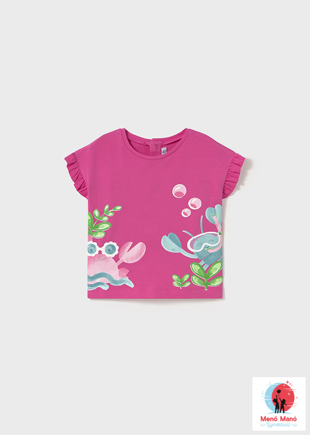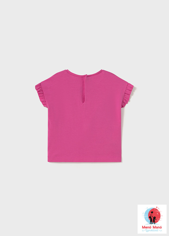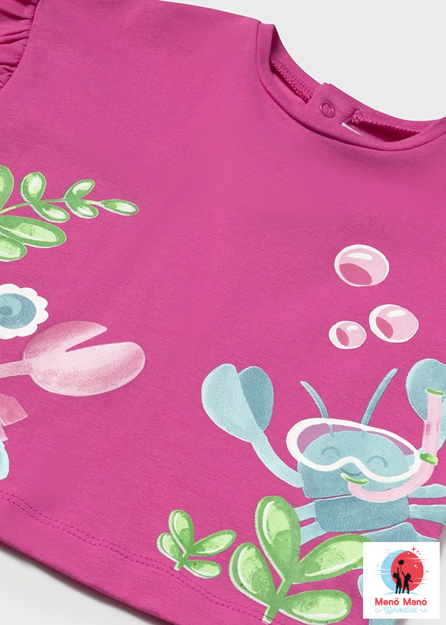 Fukszia színű rövid ujjú póló a spanyol Mayoral gyártótól, lányoknak tervezve. A pólót élénk és színes grafikák díszítik, amelyek vidám és modern megjelenést kölcsönöznek a ruhadarabnak. Kiváló minőségű anyagokból készült, amelyek egész napos kényelmet biztosítanak. Ezenkívül a kialakítás mozgásszabadságot és könnyű öltözködést biztosít.Sportolásra és mindennapi viseletre egyaránt alkalmas, stílust és egyéniséget kölcsönöz a kislány öltözékének.
