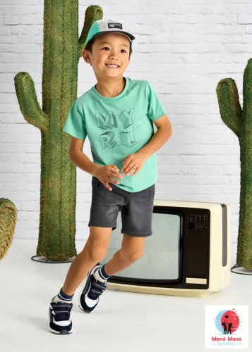 Kényelmes és stílusos fiú rövidnadrág puha farmerből, divatos szürke színben. A húzózsinórral ellátott elasztikus derékrész tökéletes illeszkedést és kényelmet biztosít viselet közben. A rövidnadrág praktikus oldalzsebekkel és modern mosott hatással rendelkezik a lezser megjelenés érdekében.